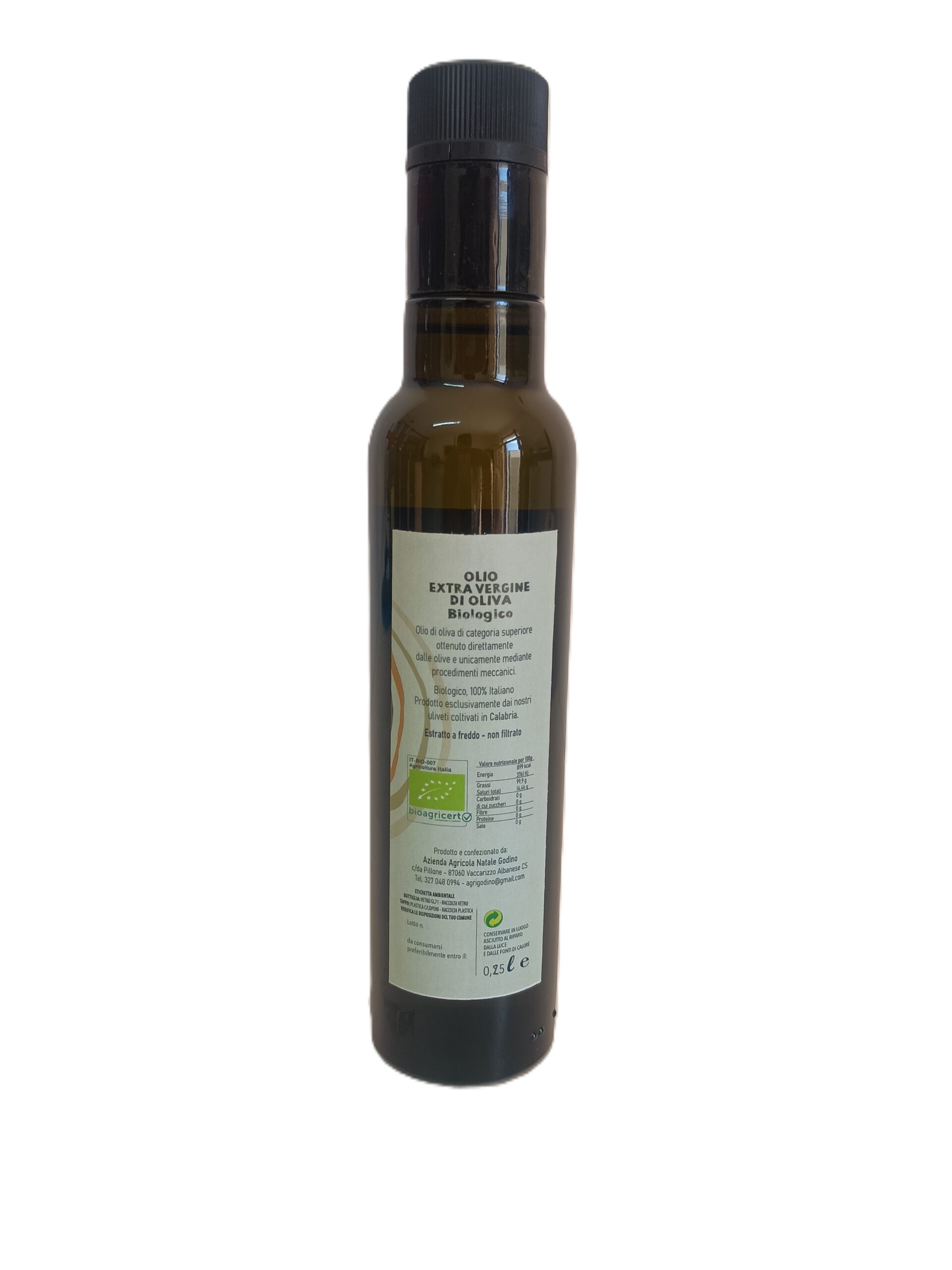 Olio extravergine di oliva biologico non filtrato, ottenuto da olive coltivate a Vaccarizzo Albanese (CS). Estratto a freddo, dal gusto intenso e autentico, ideale per condimenti a crudo ed in cottura.